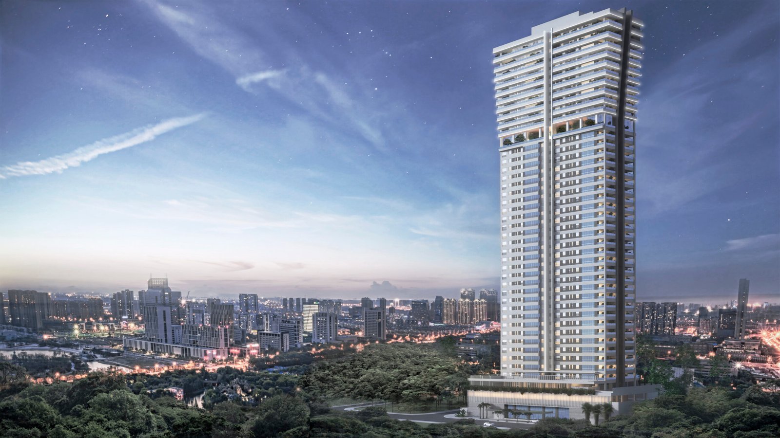 Utilizamos a análise biônica de uma rosa, que se abre em seu topo, para a concepção da facha. A inspiração surgiu das rosas distribuídas nos shows do cantor Roberto Carlos, que são marca registrada nos corações dos brasileiros. Visando valorizar a localização única, com frente para o Parque Flamboyant e fundo com a praça das Artes, projetamos uma área de lazer no 33° pavimento que permite a visão de 360° a um nível de mais de 100 metros do nível da rua. Como extensão do parque e praça, o rooftop de lazer conta com uma grande área verde e ambientes aconchegantes e bem ventilados, concebendo aos usuários uma experiência única.